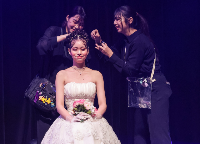 限られた時間内で求められるヘアメイクを実施するためのスピーディなヘアメイクスキルを学びます。