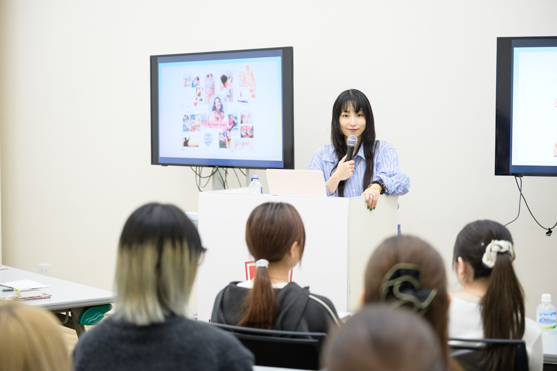 MEGUMI講師「今日の講義をふまえて、皆さんに『ビジョンボード』を作ってほしいです。これは、夢を実現するためのツールです。ひとつのボードに、女性として、キャリアウーマンとしての自分のイメージをコラージュします。文字を使ってもいいですよ!作っていくうちに自分の目標値が明確になり、世界観もわかります。趣味、仕事、家族、女性は全部を手に入れて幸せを感じる生き物だと思います。欲張りでいいと思っています!」